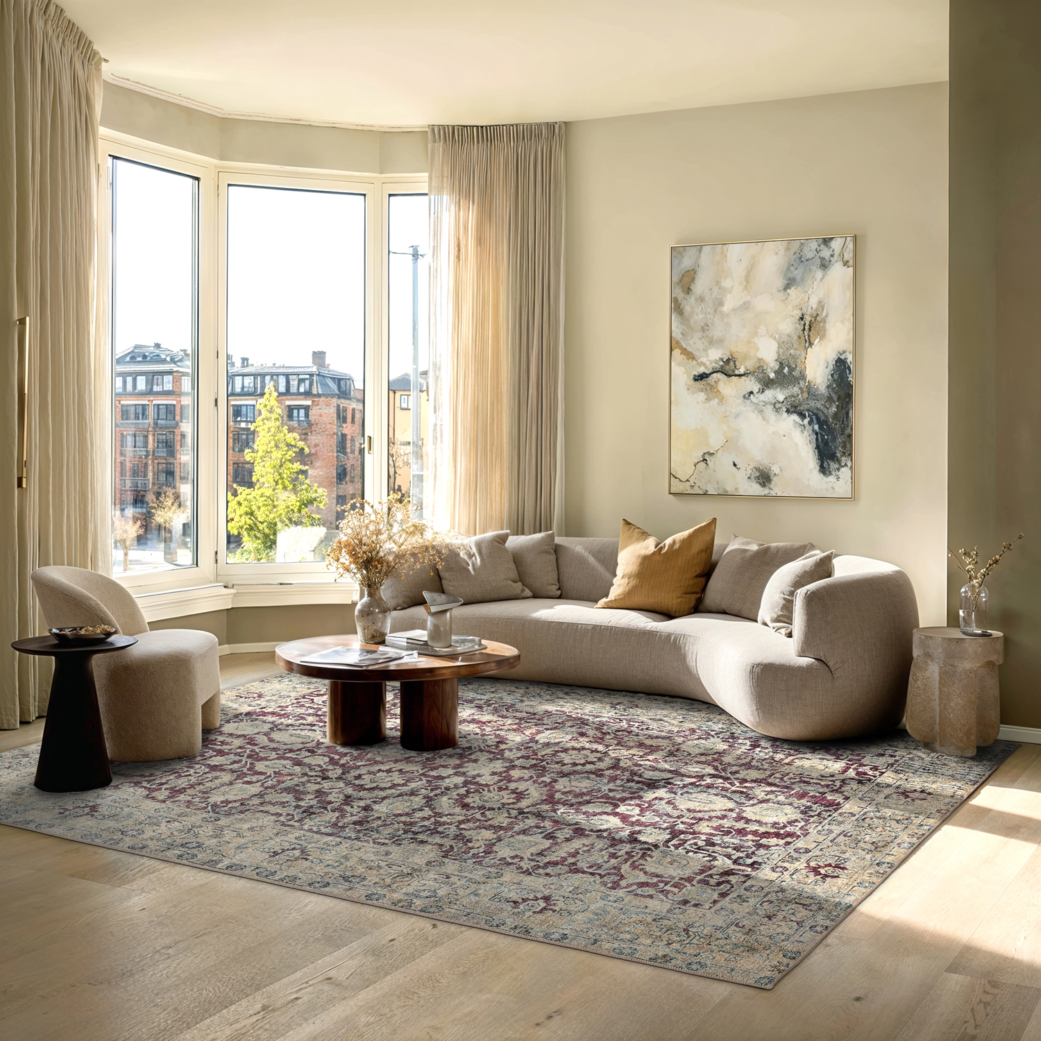 Skap en tidløs stemning hjemme med dette flatvevde teppet i elegant vintage-stil. Det slitesterke og tynne designet gjør teppet enkelt å plassere og lett å vedlikeholde, mens det vakkert aldrende mønsteret gir rommet varme og karakter. Perfekt under spisebordet, i stuen eller gangen – et teppe som kombinerer praktisk funksjon med klassisk design.
